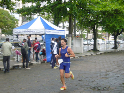 É pessoal... Mas uma meta comprida na minha longa jornada do Triathlon. Dessa vez fiz a prova Triathlon Santa Cecilia, que foi realizada em Santos. Parecia uma prova fácil mas pelo tempo terrível que fez as coisas complicaram. Estava um vento insuportável que fez o mar ficar com bastante ondulação. Os 500 metros de natação foi a minha pior parte na prova. Mostrou que preciso melhorar muito ainda na água. Sai em penúltimo do mar. Errei tb na hora de contornar a boia. Acabei perdendo a direção e passei, hahahaaa.. Não sei se eles tiraram pontos de mim.... Na volta do contorno da boia peguei uma correntesa que acabou pegando um pouco mais.....
